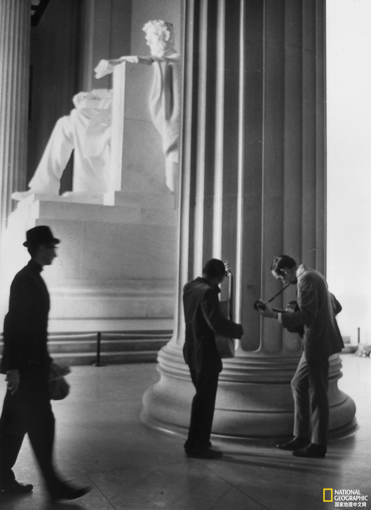 两名男子在林肯雕像旁弹奏吉他,拍摄时间未知。摄影:THREE LIONS, GETTY IMAGES