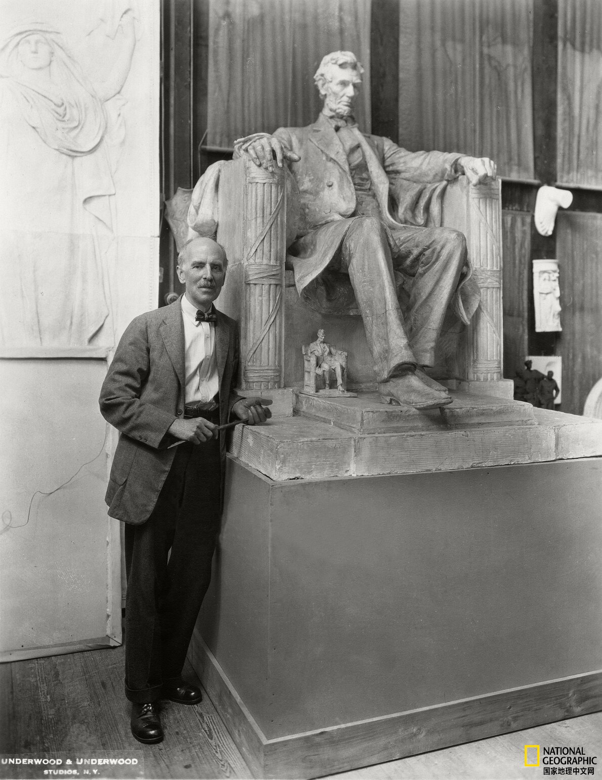 在这张1925年的照片中,雕刻家Daniel Chester French在马萨诸塞州斯托克布里奇的切斯特伍德工作室,与林肯雕像模型合影。早期版本里,林肯向下俯视,双手的姿势也不一样。供图:CHESTERWOOD