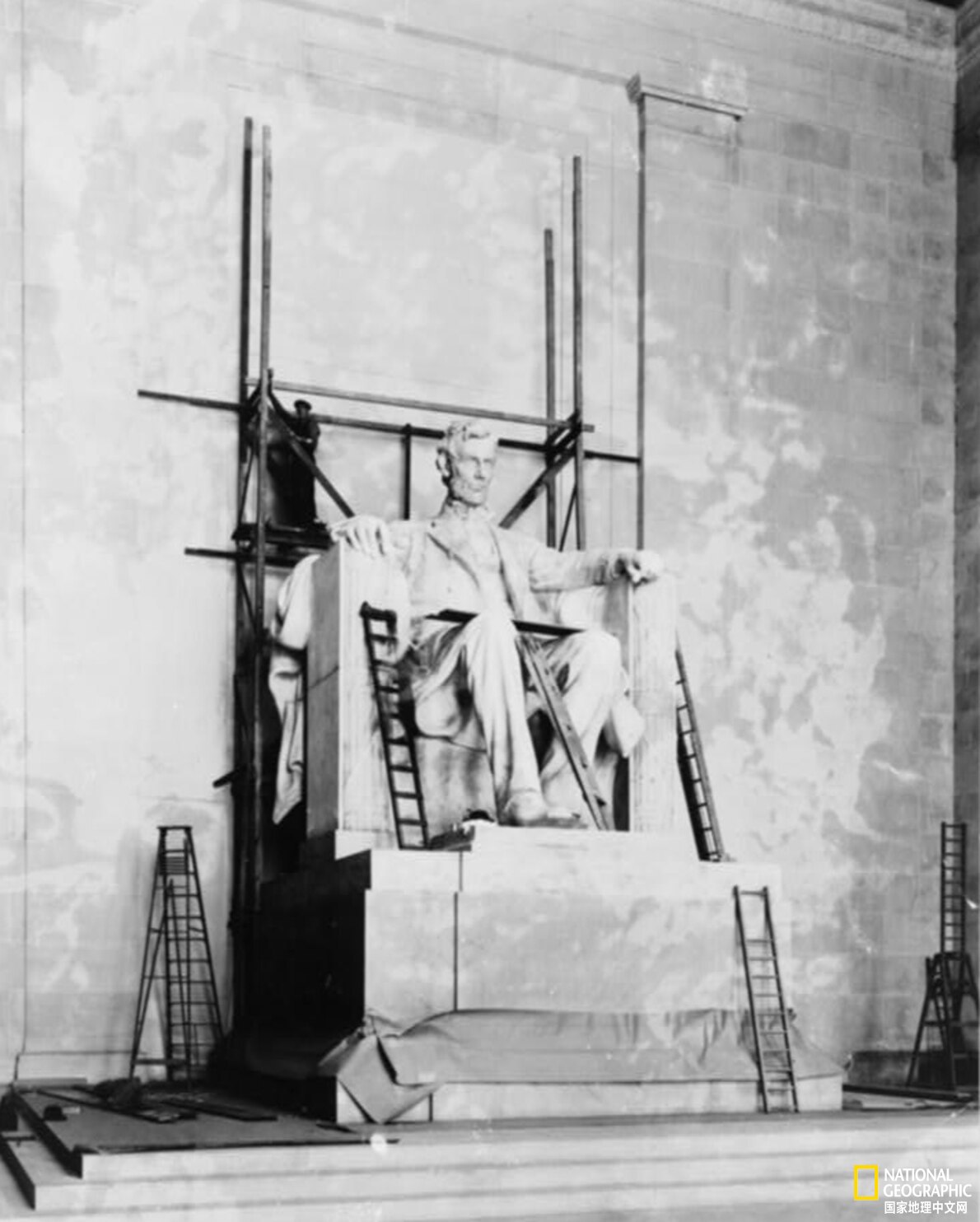 1928年,一名工人站在林肯纪念堂内的脚手架上。虽然纪念堂已于1922年竣工,但为了解决加固问题,更多工作仍在进行。摄影:UNDERWOOD & UNDERWOOD, LIBRARY OF CONGRESS