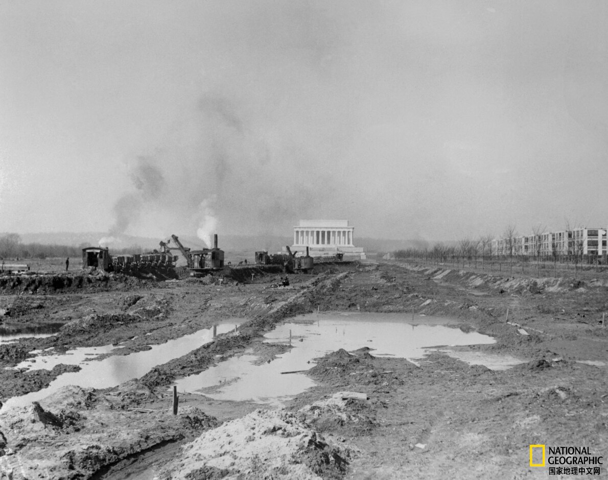 1920年3月25日,倒影池的挖掘工作正在进行。当时它被称为“镜湖”,于1923年完工。摄影:BETTMANN ARCHIVES, GETTY IMAGES