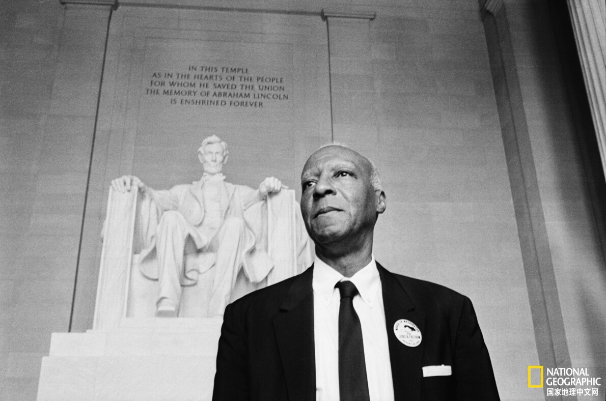 1963年8月28日,劳工领袖、华盛顿大游行的组织者Asa Philip Randolph看着聚集在纪念堂前的人群。摄影:BETTMANN ARCHIVE, GETTY IMAGES