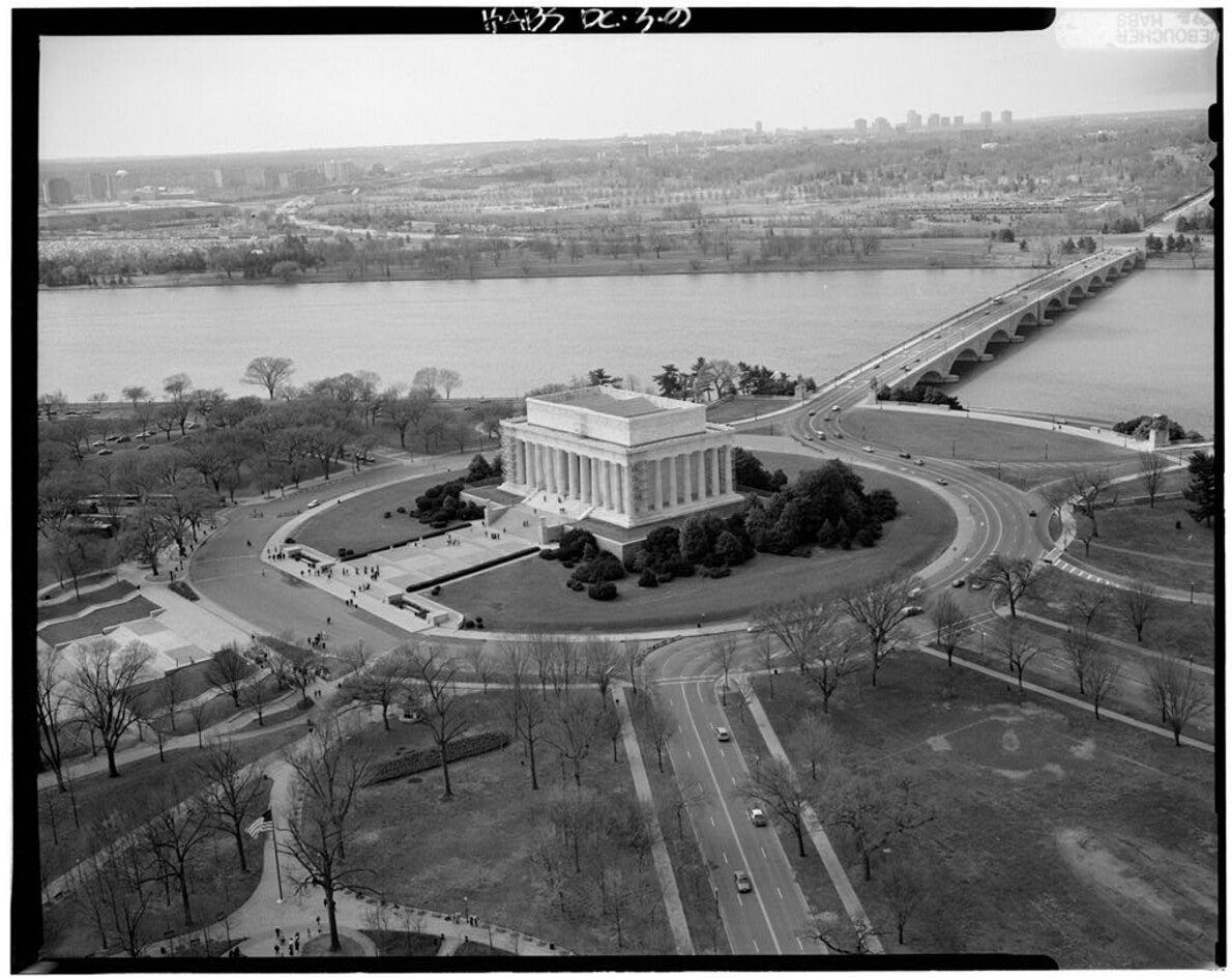 从东北方向拍摄的航拍照片,波托马克河环绕着林肯纪念堂。美国国会大厦和林肯纪念堂分别位于国家广场的东西两端,华盛顿纪念碑在二者之间。摄影:JACK BOUCHER, LIBRARY OF CONGRESS