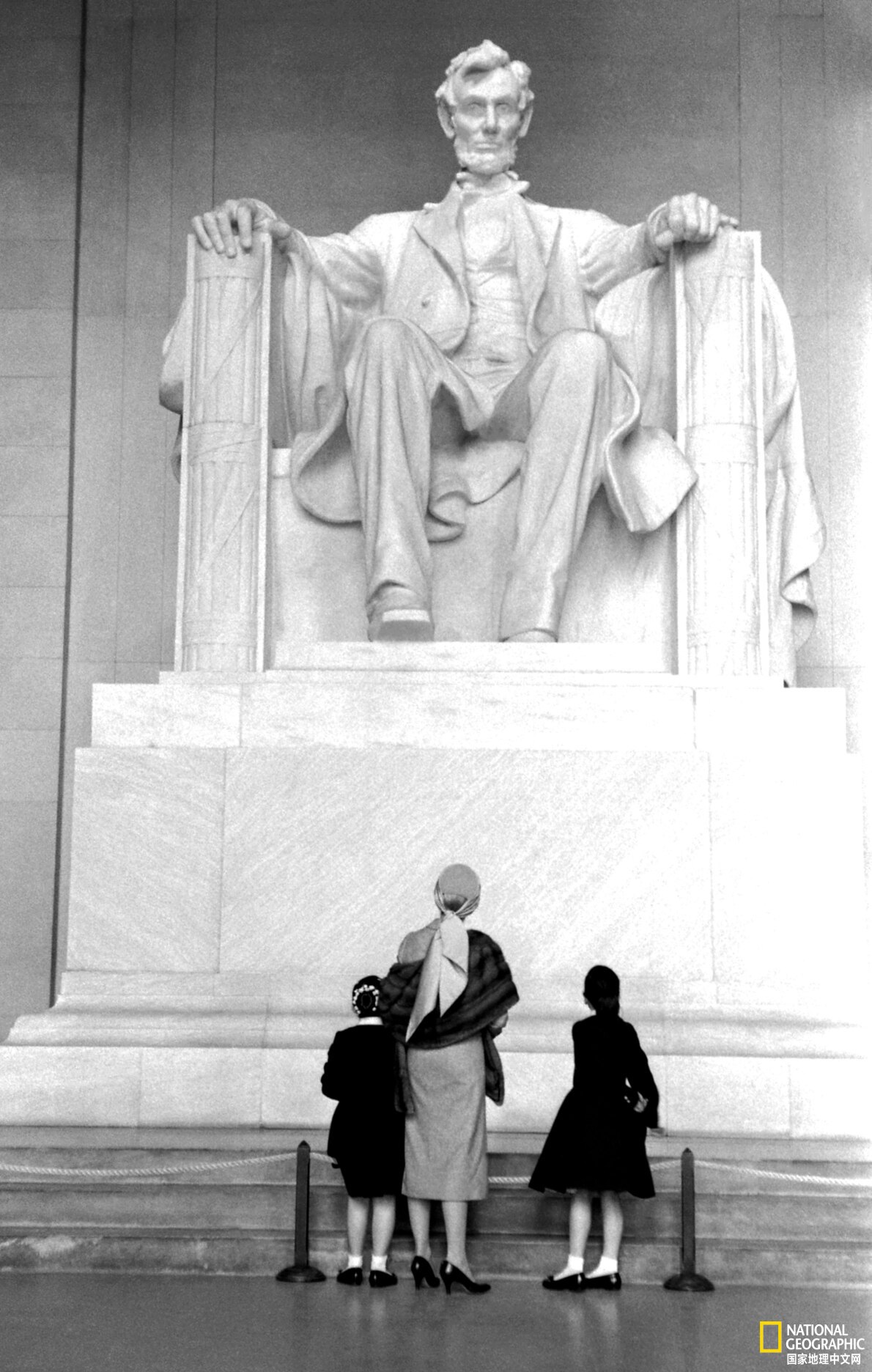 一个女人和两个女孩仰望着林肯雕像,拍摄时间未知。从基座底部算起,雕像高达9米。
