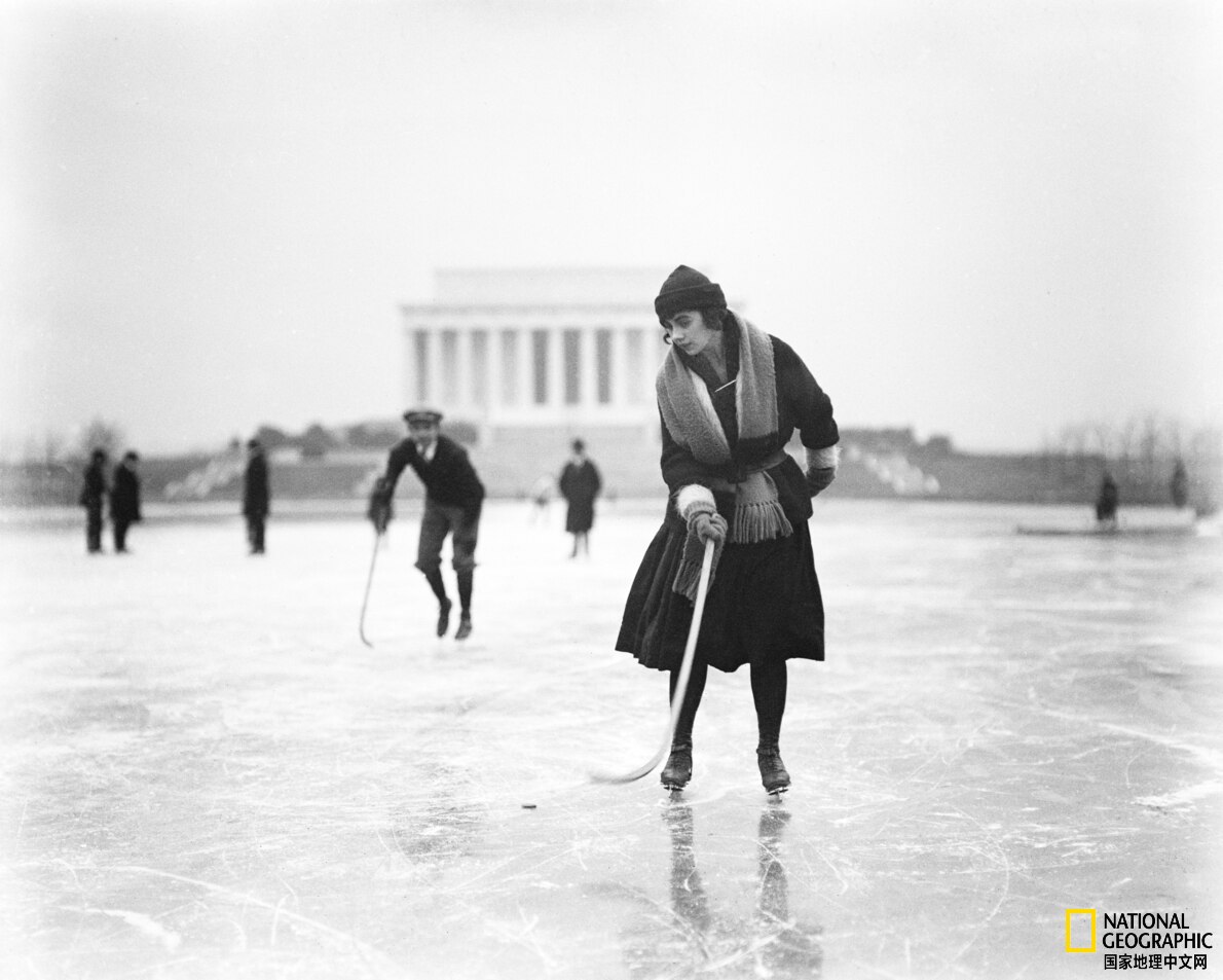 20世纪20年代,一名女子借助曲棍球球棍,在倒影池滑冰;当时允许滑冰非常罕见。多年来,不断有人提议把倒影池改造成冬季滑冰场,但出于安全因素都被否决了。摄影:HARRIS & EWING, GETTY IMAGES