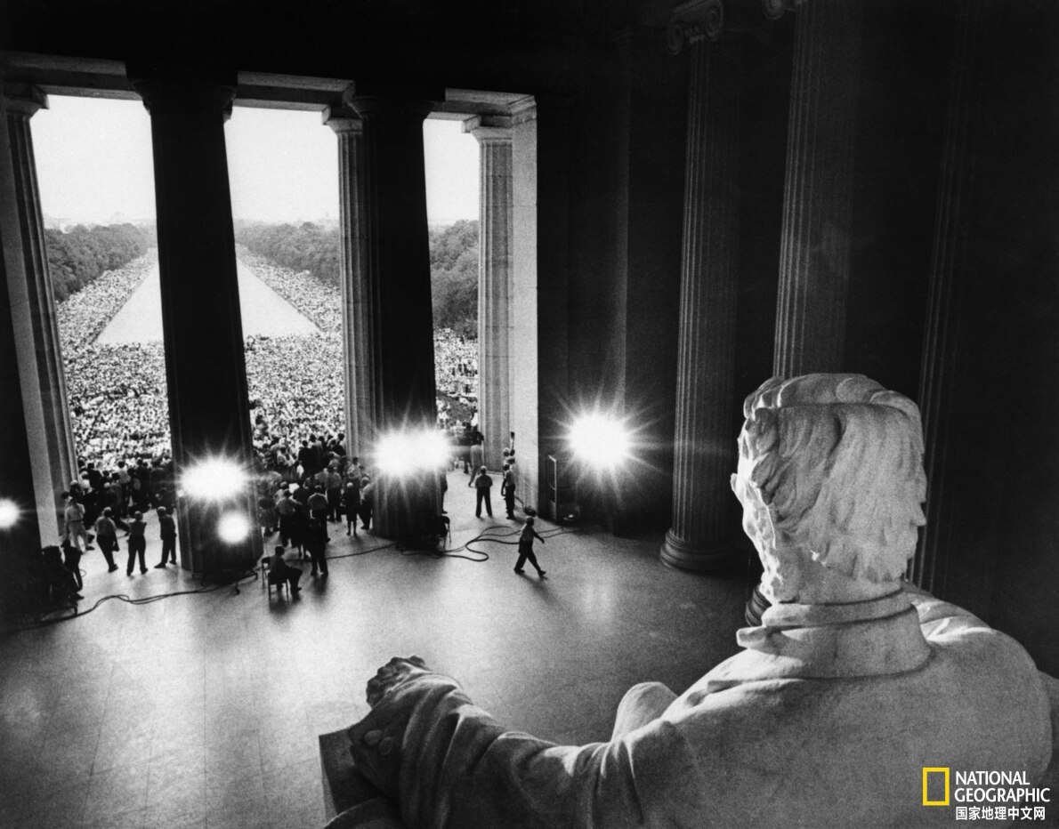 1963年8月28日,华盛顿大游行的人群聚集在林肯纪念堂前,抗议种族歧视。林肯纪念堂见证了无数这样的历史事件。当天,牧师马丁·路德·金在纪念堂的台阶上,发表了著名演讲《我有一个梦想》。摄影:BETTMANN ARCHIVE, GETTY IMAGES