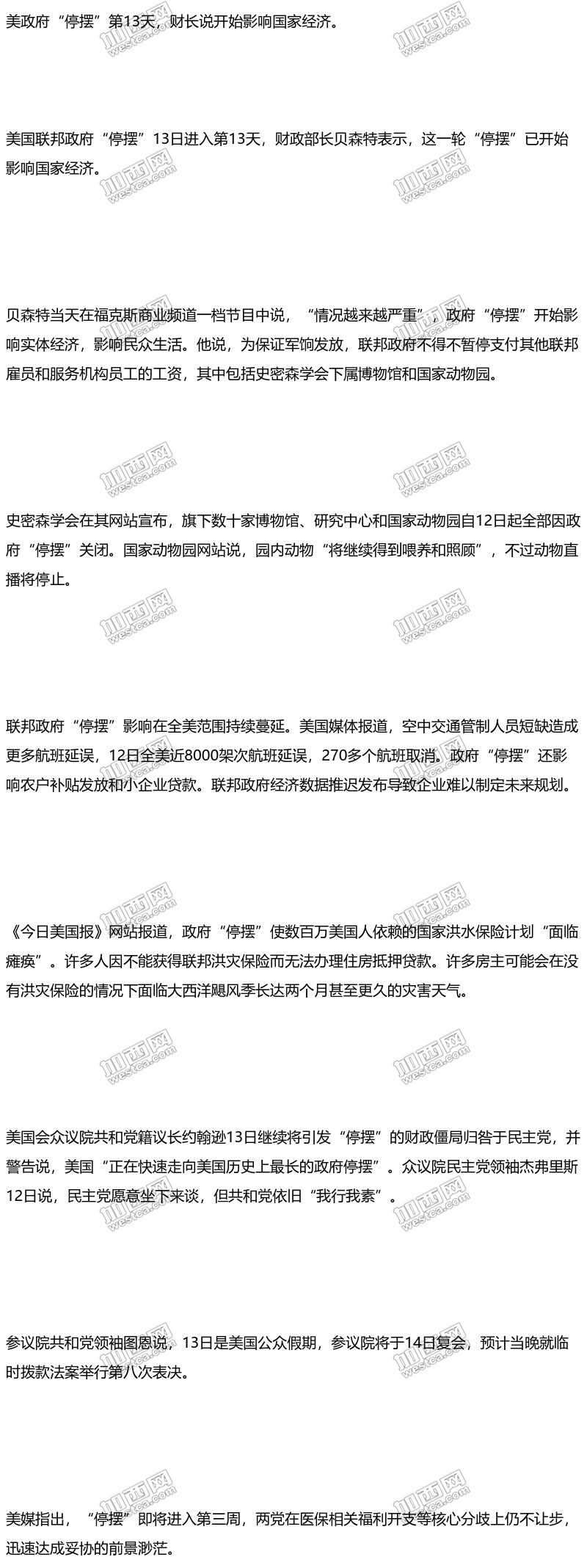 贝森特当天在福克斯商业频道一档节目中说,“情况越来越严重”,政府“停摆”开始影响实体经济,影响民众生活。他说,为保证军饷发放,联邦政府不得不暂停支付其他联邦雇员和服务机构员工的工资,其中包括史密森学会下属博物馆和国家动物园。