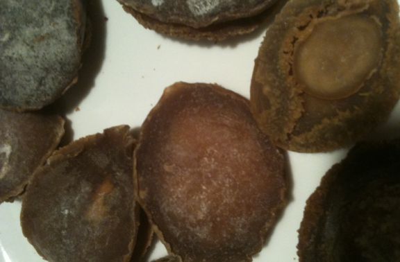 | 无题 原来上面没这些白色的东西的,颜色黑的地方也没这么黑,放塑料袋里,忘记放冰箱了,结果就成了这样。