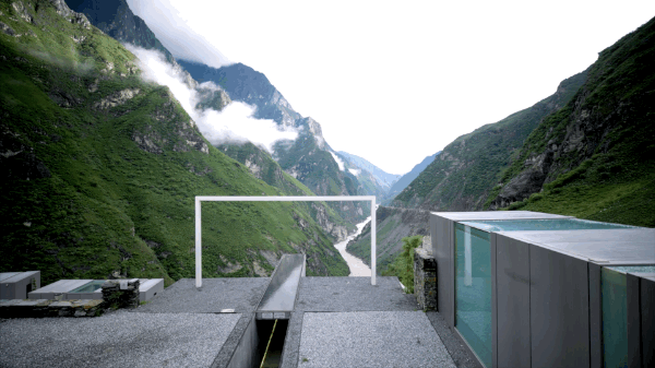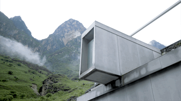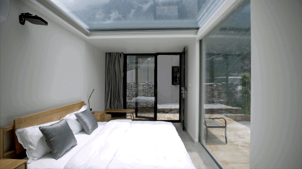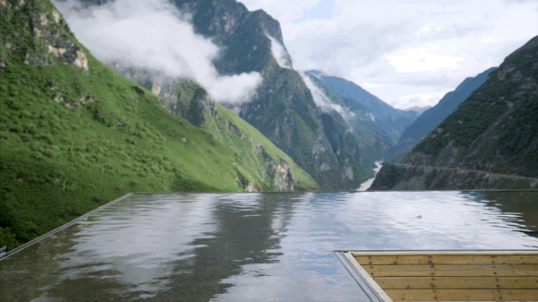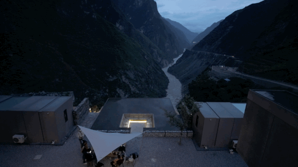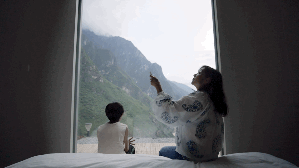 靠近懸崖一側的外牆,設計了一個巨大的落地窗,和一個可調節的幕布。無論是晨起或者黃昏,只要打開它,就能看到波濤洶湧的大峽谷,或者玉龍雪山主峰。
