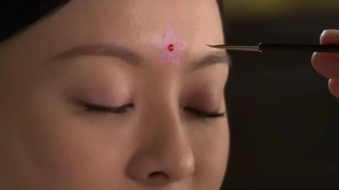 这段戏虽没有史料依据,但却透着几分真实感,在古代,丈夫为妻子画眉是一种象征着爱意与情致的举动,描绘花钿更是如此。而且在化妆品种类稀少的情况下,眼唇妆容都用胭脂上色,颜色多以粉红为主。