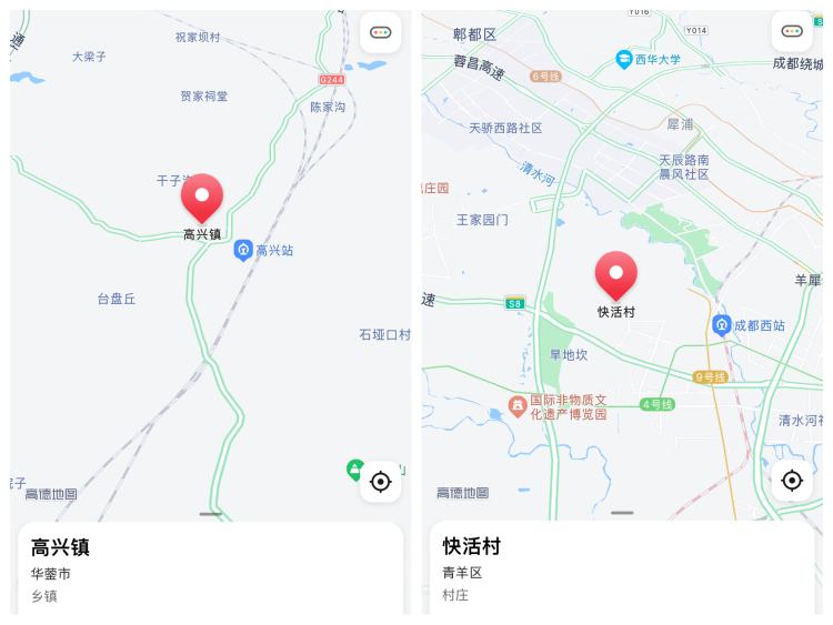 华蓥市的高兴镇和成都市的快活村。/高德地图