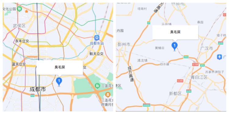 成都的两个“臭毛屎”一个在南边,一个在北边。/百度地图