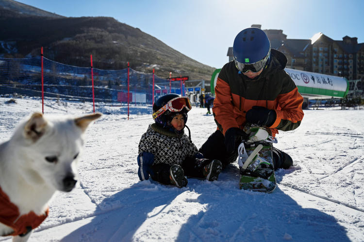 2021 年 11月 24 日,张家口某滑雪场,一名父亲正在帮他的女儿脱下滑雪板。 /图· 视觉中国