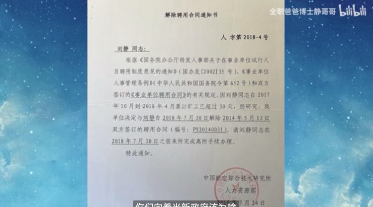2018年7月24日,刘静前单位以不连续旷工30日为由向刘静开出了辞退单。/bilibili@全职爸爸博士静哥哥