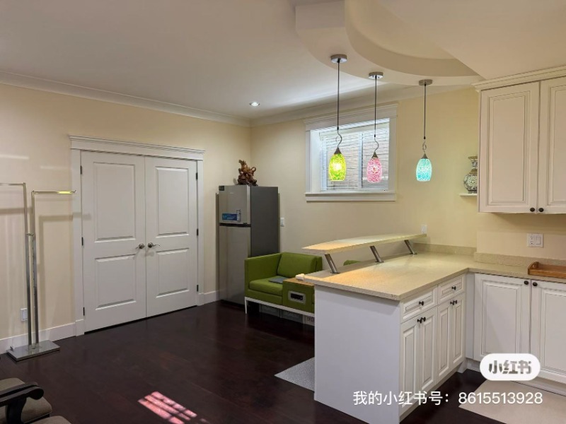 1. 地下室套房,獨享較大獨立起居空間,起居室配冰箱吧台,共享側門入口,共享主層敞亮廚房餐廳和客廳家庭廳。
