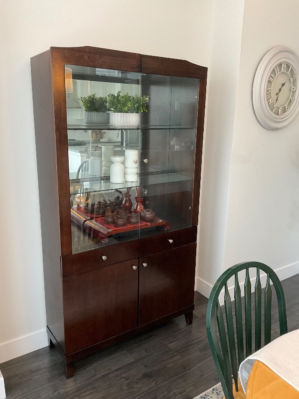 實木餐廳邊櫃(內置展示燈)China Cabinet with Showcase Lights搬家甩賣! 棕色實木餐廳邊櫃(內置展示燈) 現降價求售 $480,3年前購入時價格 $1,200 + 稅。 保養如新,狀態極佳! 如有需要,可協助送貨。 短信聯系:(604)23... |