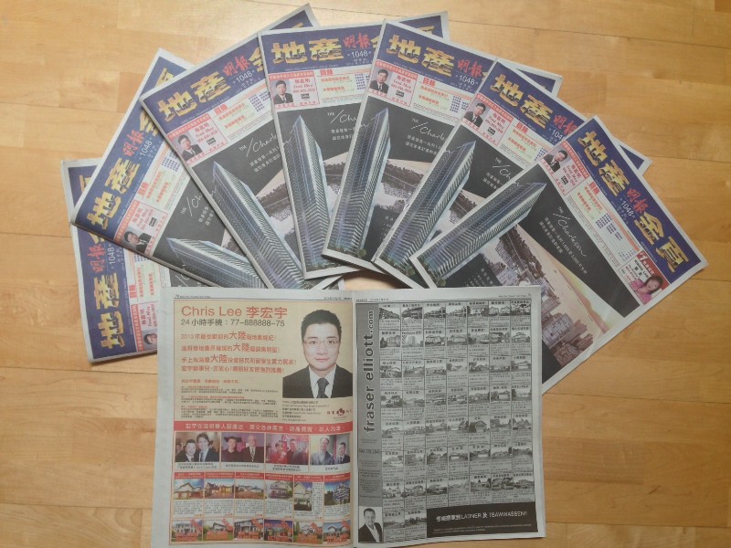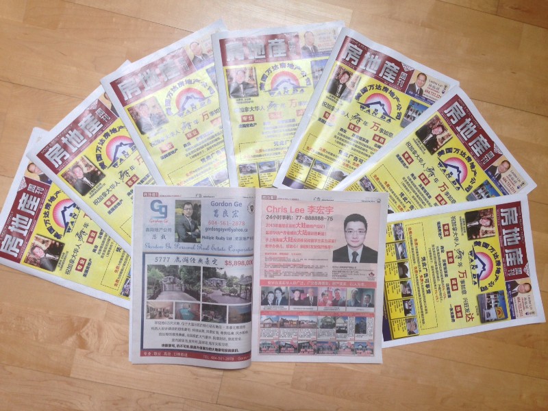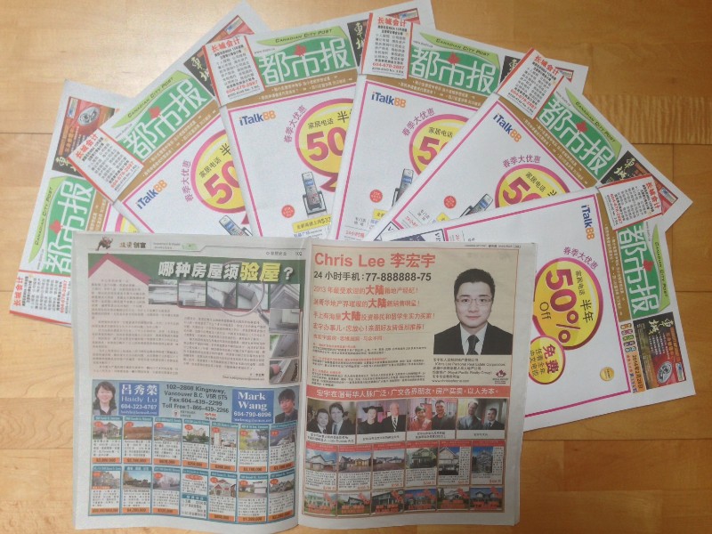 温哥华最重量级报纸都市报、地产金页、房地产周刊全彩整页广告,每周发行投放量共15万份: