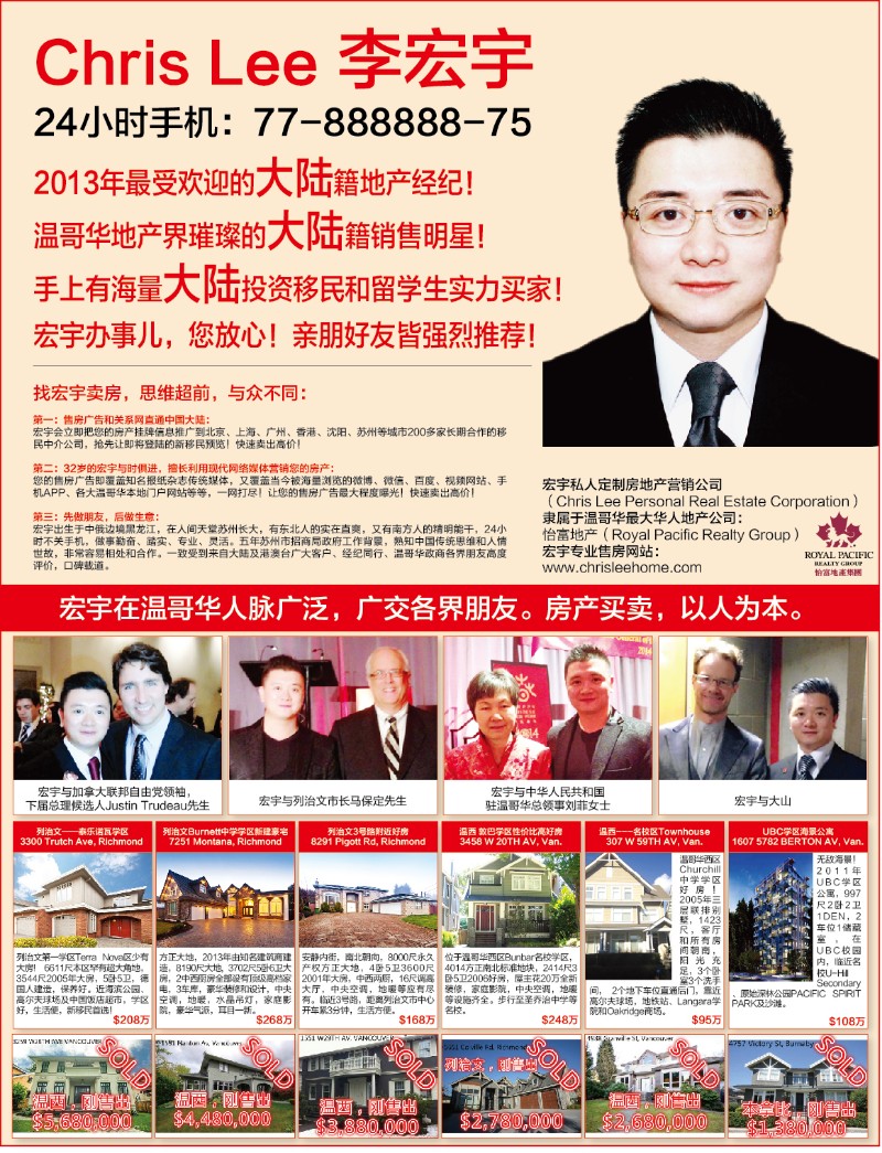 第三:先做朋友,后做生意:宏宇出生于中俄边境黑龙江,在人间天堂苏州长大,有东北人的实在直爽,又有南方人的精明能干,24小时不关手机,做事勤奋、踏实、专业、灵活。五年苏州市招商局政府工作背景,熟知中国传统思维和人情世故,非常容易相处和合作。一致受到来自大陆及港澳台广大客户、经纪同行、温哥华政商各界朋友高度评价,口碑载道。