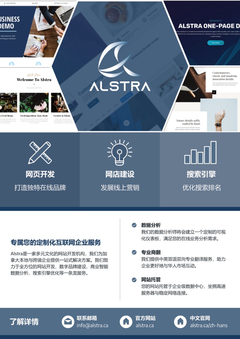 Alstra 是一家注册于多伦多的网站开发机构,我们拥抱多元文化,帮助海内外华人商家提供一站式解决方案。我们致力于全方位的企业网站设计、数字品牌建设、商业智能数据分析、搜索引擎优化、数据中心托管等一条龙服务。