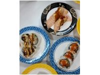 客人从回转输送带上自选自取菜肴,自由度很高,一次就餐可以品尝到很多种美味;店家根据盘子的颜色和图案计算客人用餐费用,省时省力。不错的操作方式哦。