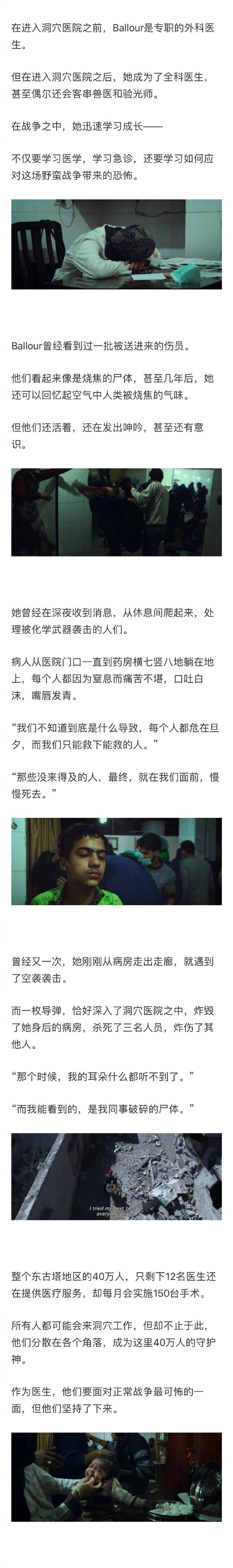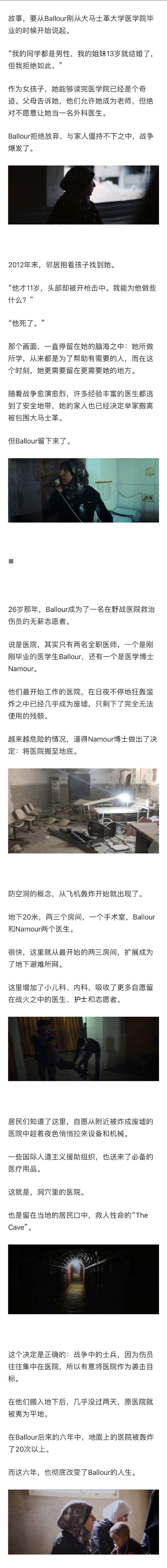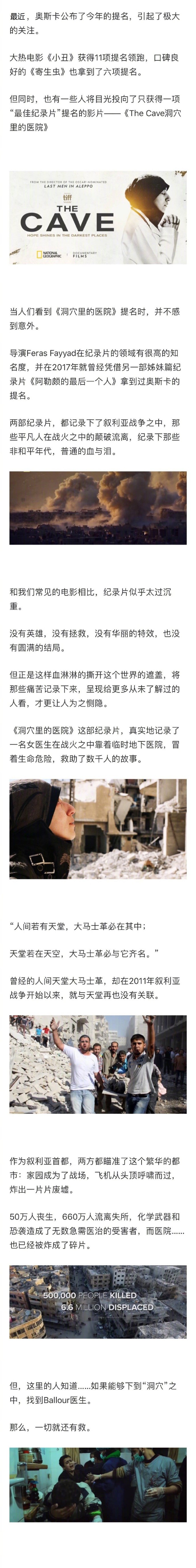 最近获得奥斯卡提名的纪录片《洞穴里的医院》让很多人都将目光投向了大马士革这个昏暗的临时地下医院。在叙利亚战火纷飞的轰炸中,女医生Ballour留在了最危险的地方,在六年之中,靠着深埋于地下20米的一间破旧医院,救下了几万人……
