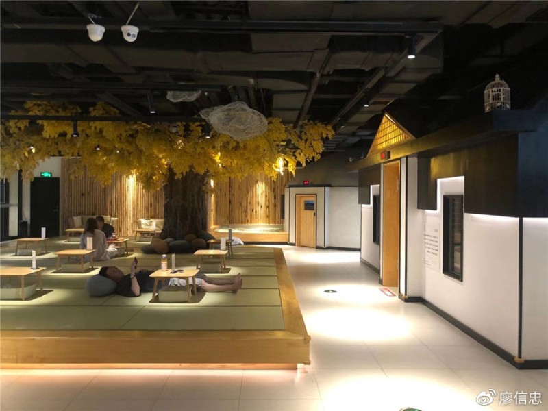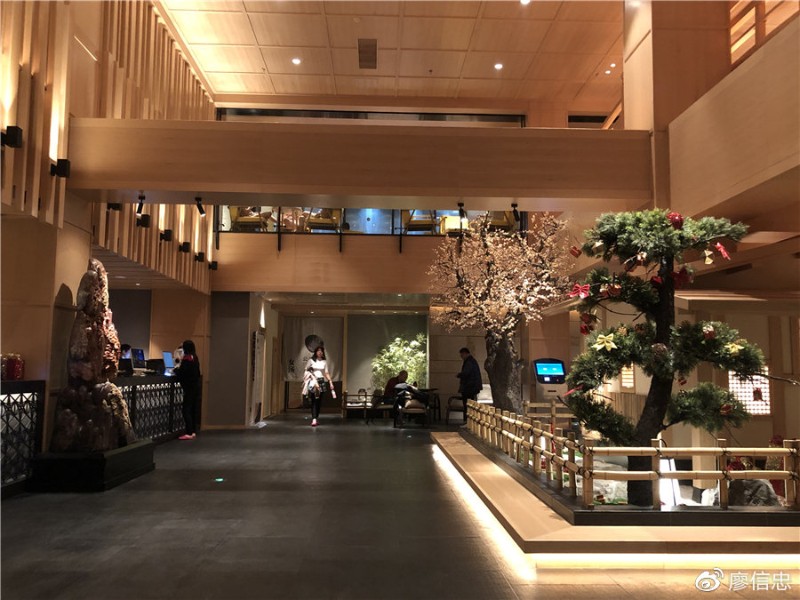 这是另一间洗浴中心─北方暖暖的大堂,也是宽敞明亮的原木风,像五星级酒店,完全打破你对洗浴中心大堂金碧辉煌而俗气的印象,当然现在这种宽敞明亮的大堂也很普遍了;在中庭,它复制了一整个日本的茶室小屋。