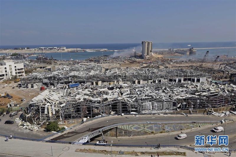 這是8月5日在黎巴嫩首都貝魯特拍攝的爆炸過後的港口區景象。 黎巴嫩首都貝魯特港口區4日傍晚發生劇烈爆炸。截至5日晨,爆炸已造成至少100人死亡,另有4000多人受傷。