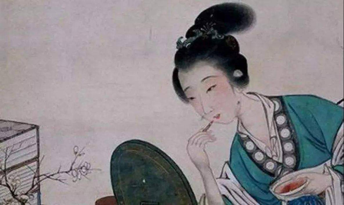 也叫点口脂。在现代口红出现之前,古人的胭红和胭脂是通用的,把胭脂放在小盒子中,需要用的时候,拿手指直接蘸上,点涂到嘴唇上。用来涂唇的胭脂原料主要是在动物脂肪中加入香料和红蓝花来进行染色,就能出现各种各样的颜色,总共有20多种。有的唇脂配方中还会加入朱砂、蜜蜡、香油等调料。
