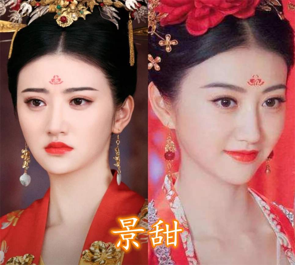 就是在脸上贴梅花状的花钿。传说这种妆容的由来,是因为南朝的寿阳公主,在含章殿外的树下睡觉的时候,一阵微风把一朵梅花吹落到了公主的额头上。公主的额头被梅花染上花瓣的形状,三日都不曾掉落。见此状,宫女和妃子们纷纷用金银或者绸缎做成梅花状,贴到自己额头上,成为当时最流行的妆容。