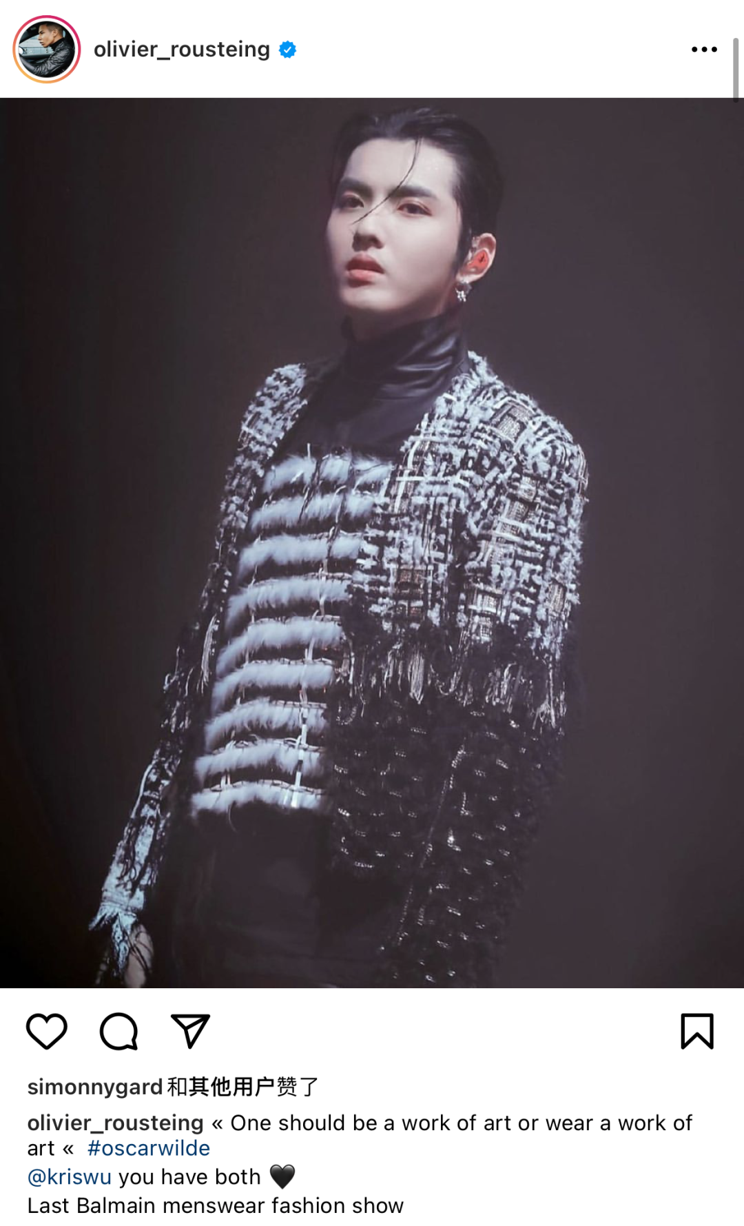 说到吴亦凡的时尚完成度,就连Balmain创意总监Olivier都赞不绝口:“一个人要么穿上一件艺术品,要么成为艺术品,吴亦凡两者兼备。”Kris Wu走到哪里,哪里就是秀场!