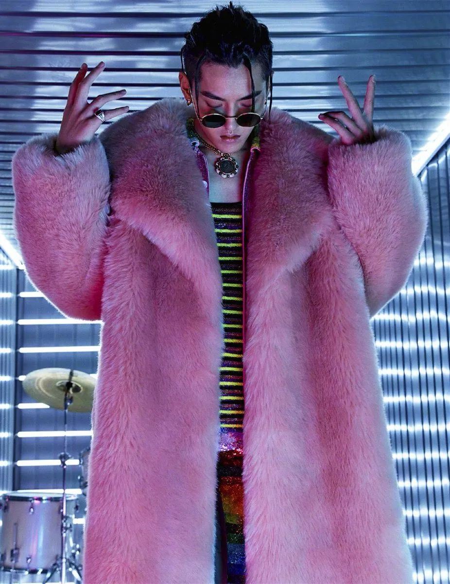 值得一提的是他跨界性别的穿衣风潮和带货能力,把女装穿得帅气又有自己的风格,鲜艳柔美的衣服也依然时髦好看,有气势,贵气的Veevo zhao粉色皮草让他穿出了嘻哈范儿。
