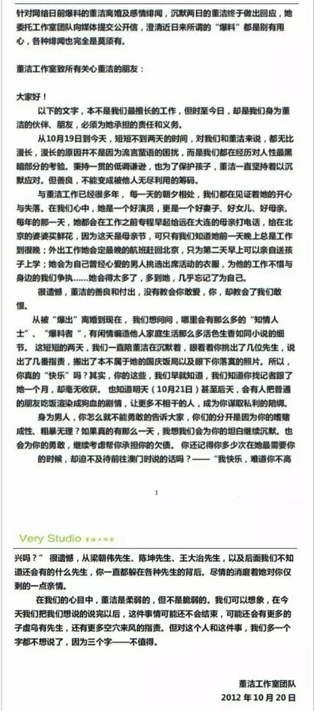 2012年10月,董潔的工作室單方面發表聲明“已經和潘粵明離婚”。