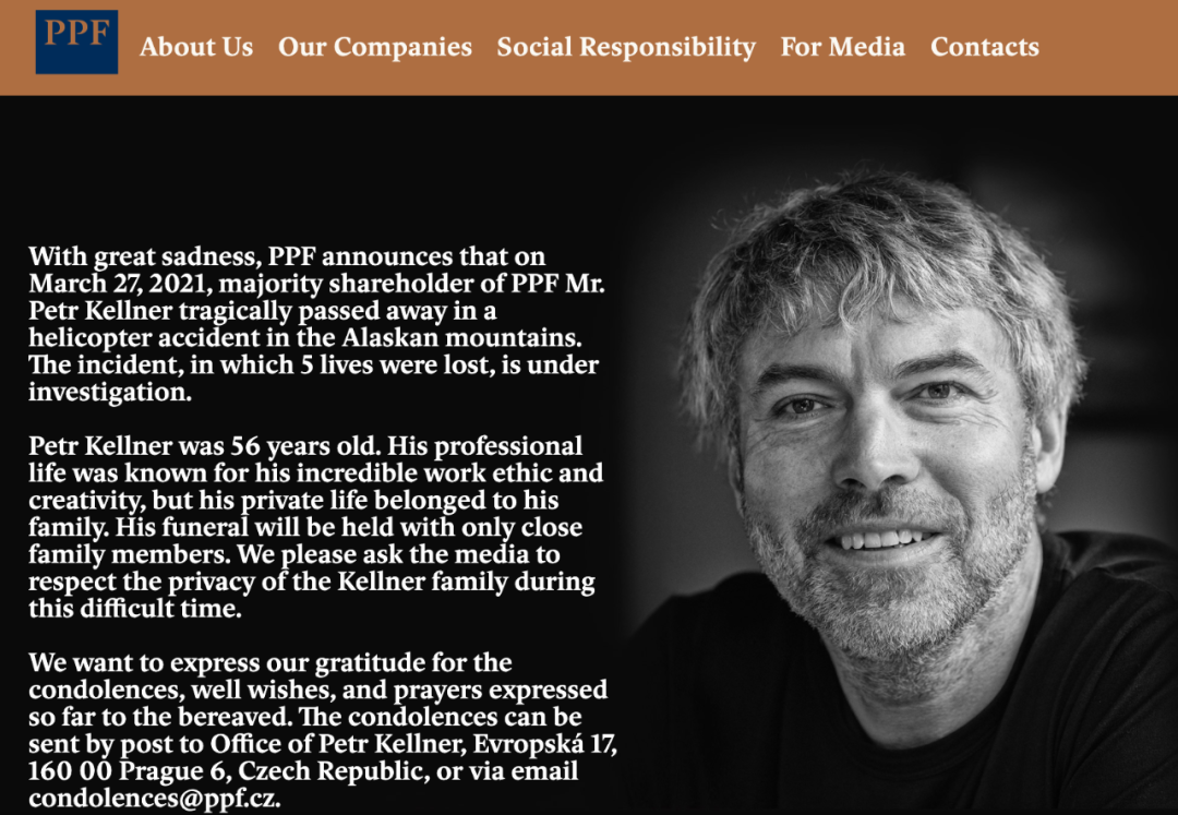 前两天,美国阿拉斯加州南部尼克冰川地区一架观光直升机坠毁。56岁的捷克首富、PPF集团创始人彼得·凯尔纳在这次事故中丧生,随后PPF集团官网也公布了这一不幸事件。