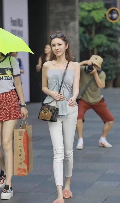 这个美女走在大街上一定是回头率相当高的,从照片中可以清楚的看到有街头摄影师不停的拍照。美女的身材非常棒,有着精致的锁骨和圆润的香肩,穿上一件灰色抹胸上衣完美的诠释了美女的性感。配上一条白色紧身裤,美女的腿型非常好,穿紧身裤也是非常的好看。脚上穿了一双毛绒拖鞋,这样的穿搭也是今年非常流行的搭配,适合身材较好的女生穿着。