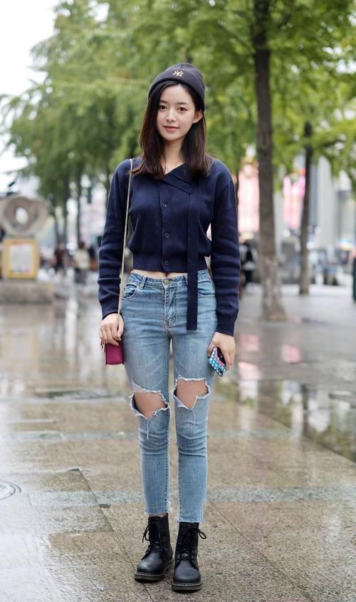这个小姐姐看上去很可爱,长了一张娃娃脸,显得非常的清纯,有一种小清新的感觉。小姐姐头上戴着一顶紫色的小帽子,和小姐姐的气质很搭。上身穿了一件深蓝色的高腰针织衫,配上紧身牛仔裤完美的展现出了小姐姐的好身材,加上破洞设计时尚感更加强烈。脚上穿一双圆头大靴子,很中性化的一款靴子,给人一种很帅气的感觉。