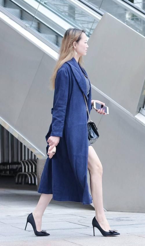 这个美女同样也是只拍到了侧面,美女的身材不错,气质也很出众,同样给人一种职场女强人的感觉。从面看美女的五官非常精致,特别是鼻子长的很好看,有点点“鹰钩鼻”的感觉,鼻子好看的女生通常颜值也会比较高,因为高高凸起的鼻梁会让面部轮廓更加精致。美女穿了一件深蓝色的呢子大衣,里面应该是穿的裙装露出白嫩的双腿,配上黑色尖头细高跟鞋,完美的展示了成熟女人的性感。