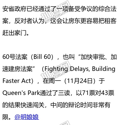 不允许租客在房东和租客委员会(LTB)的听证会上临时提出新问题;如果房东想把房子收回自用,只要提前120天通知,就不需要付补偿金;此外,还缩短了因拖欠房租而驱逐租客的等待期。