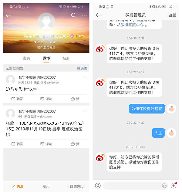 张小宁被性侵反遭不明账号恶意曝光,她投诉了半年微博才关闭此账号。(受访者提供)
