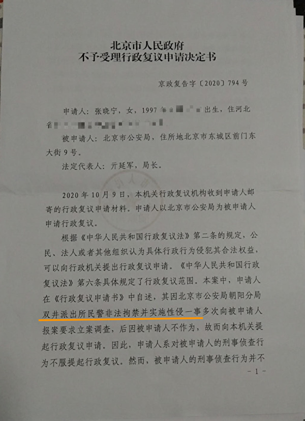 张小宁就双井派出所警察非法拘禁及性侵案多次要求立案,但无人受理。(受访者提供)