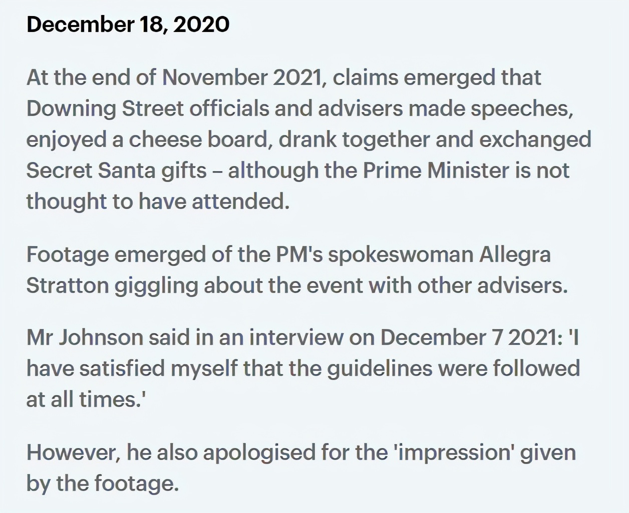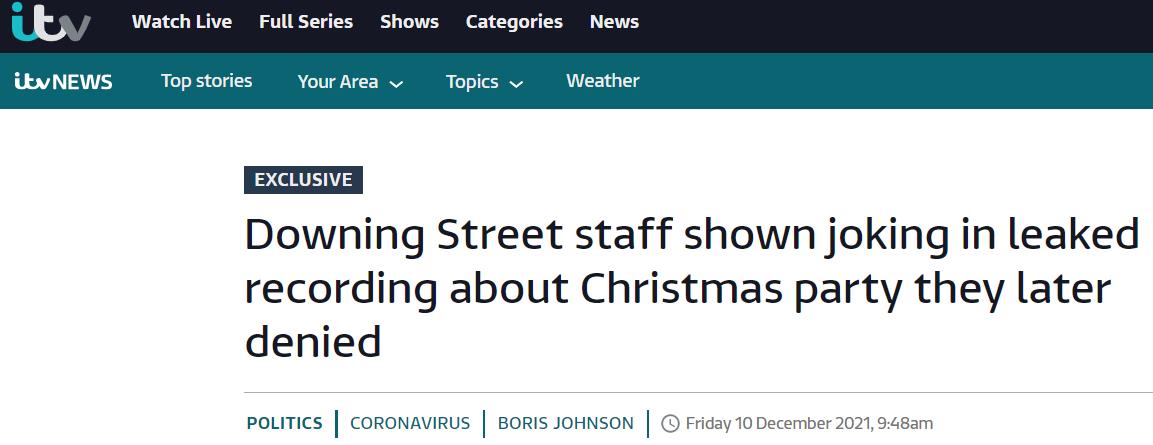 2021年12月7日,ITV电视台收到一条爆料视频,讲的是唐宁街的工作人员拿这次圣诞派对开玩笑。