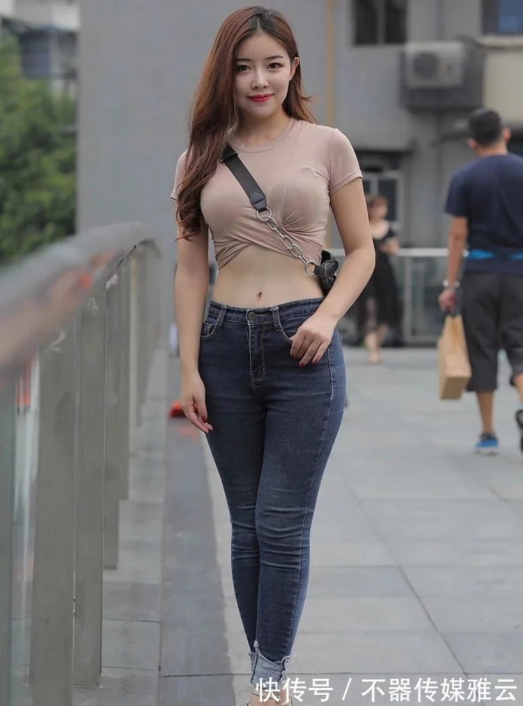 牛仔裤搭配短款上衣,休闲舒适又不显胖,美的个性又时尚
