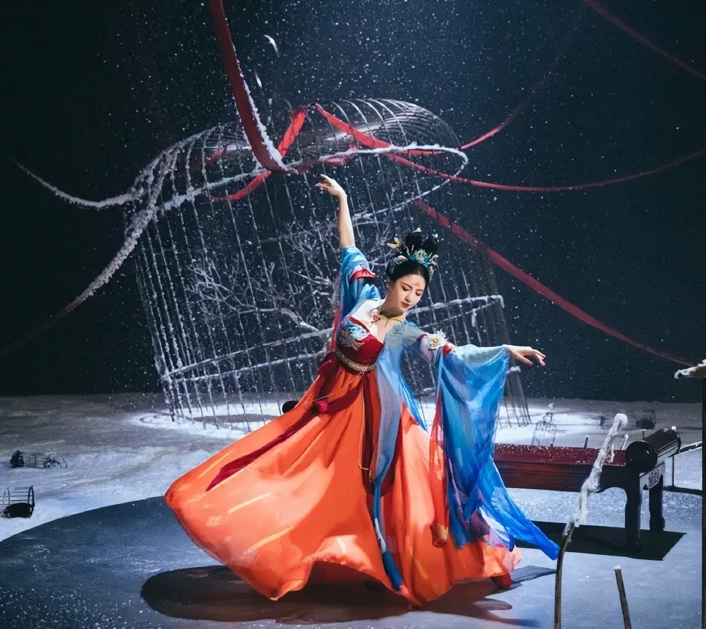 跳《雨铃霖》时,以舞蹈表现古诗,仿佛《秦时明月》中的动漫形象雪女穿越到现代,动人心弦、美不胜收;