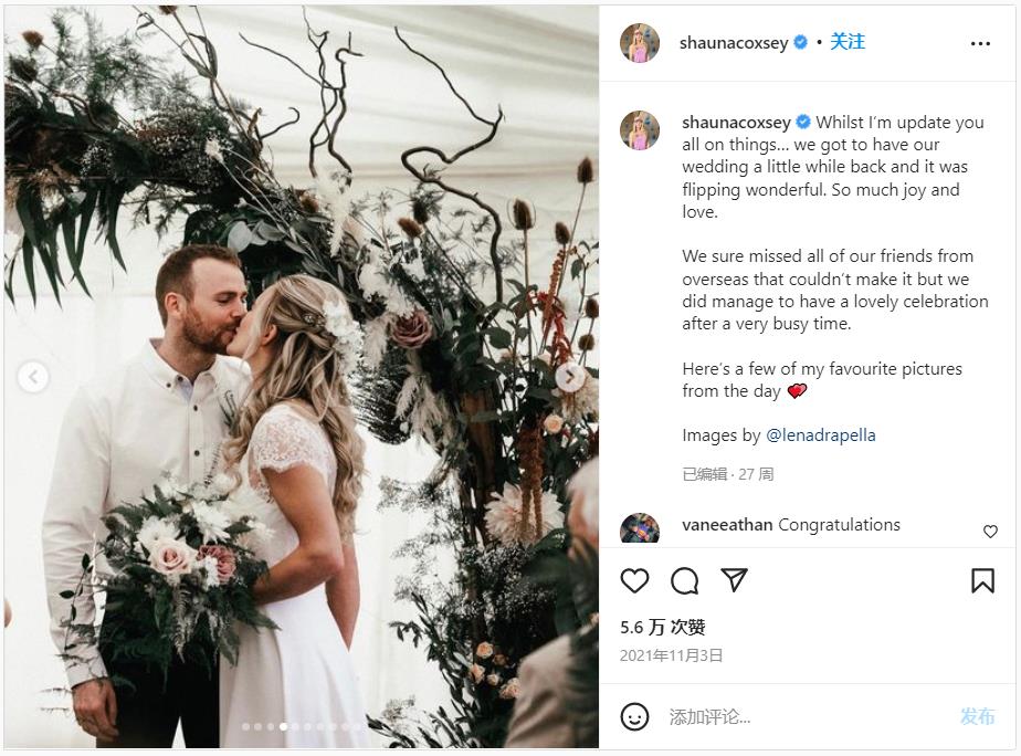 去年11月,Shauna在Instagram上公开婚讯,表示不久之前刚刚举行婚礼,
