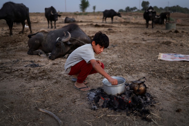 6月24日,伊拉克纳杰夫市郊Al-Mishkhab,Mustafa Ahmed生火煮热水牛奶。