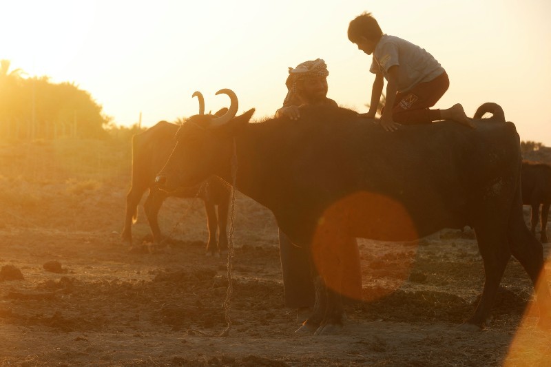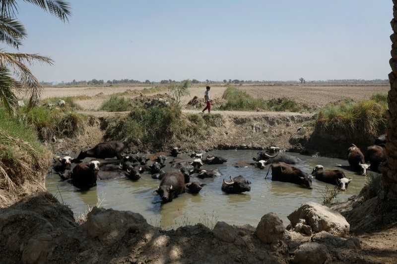 6月23日,伊拉克纳杰夫(Najaf)市郊Al-Mishkhab,Mustafa Ahmed(13岁)帮忙看管他家所养的水牛。