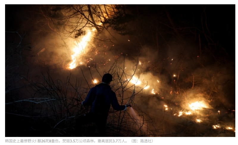 重伤、22人轻伤,山林燃烧面积达3万6009公顷,超过2000年时的东海岸山林大火(燃烧面积达2万3794公顷),堪称历年来伤亡与灾损最惨烈,不仅焚烧云岚寺、孤云寺等千年古刹,位于庆尚北道安东市的屏山书院、河回村等重要儒家文化古迹更是岌岌可危。