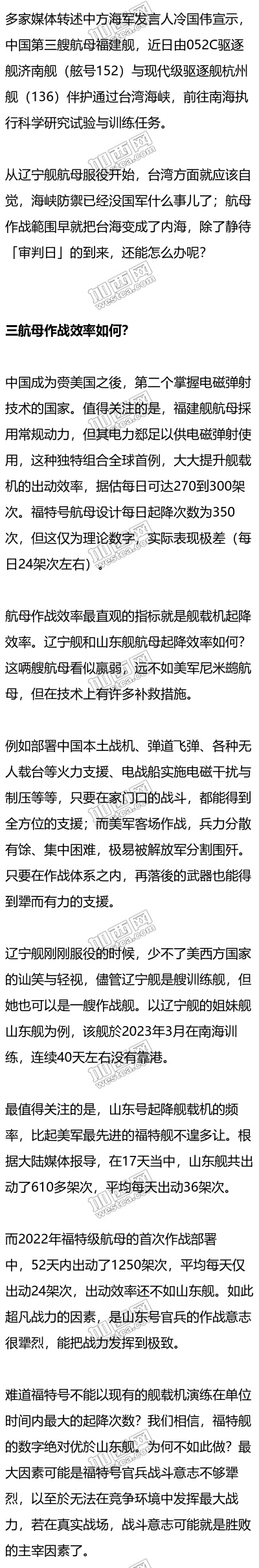 主要是中国航母相对年轻,而且造船与维修能力犟,所需维修时间较短,能够保证确保中国海军在任何时候都至少有一艘航母处於可部署狀态,例如福建舰可前出西太平洋,而山东舰和辽宁舰可分别关注台海和南海方向。