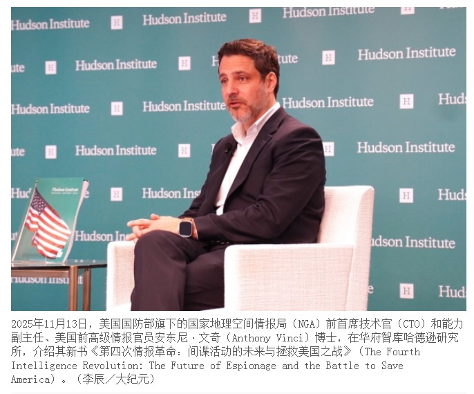 【da纪元2025年11月17日讯】(da纪元记者李辰美国华盛顿DC报导)美国国防部旗下的国家地理空间情报局(NGA)的前首席技术官(CTO)和能力副主任、前高级情报官员安东尼·文奇(Anthony Vinci)博士11月13日告诉da纪元,中共利用美国的社交媒体攻击法轮gong和神yun艺术团等行为,是在美国发起“认知战”。