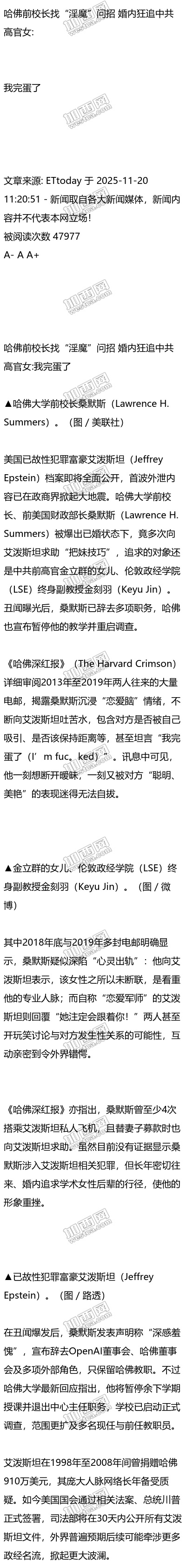 哈佛前校長找“淫魔”問招 婚內狂追中共高官女
