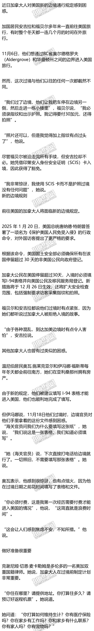 切恩·麦卡勒姆表示,每个边境官员对进入美国的旅客可能会有不同的问题或要求,这可能是部分加拿大人遇到不同结果的原因。