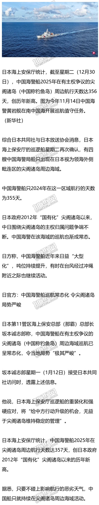 中国海警船2025年在钓鱼岛周边航行356天 创历年新高
